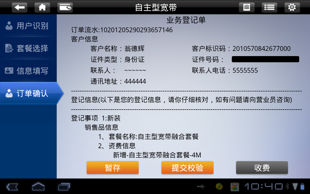 第二步:业务人员录入客户身份信息和相关业务信息,最后点击“订单确认”,生成电子工单。